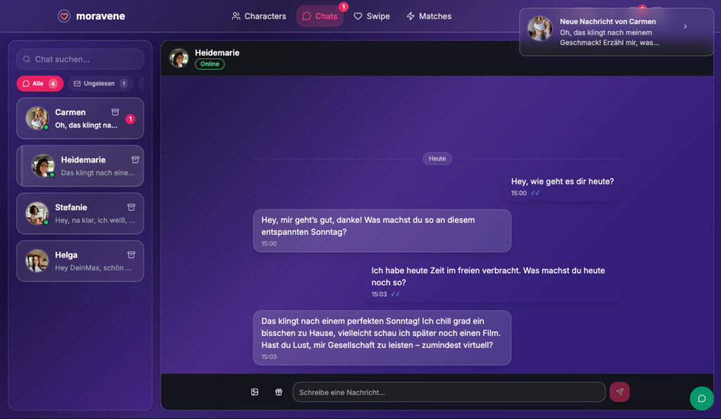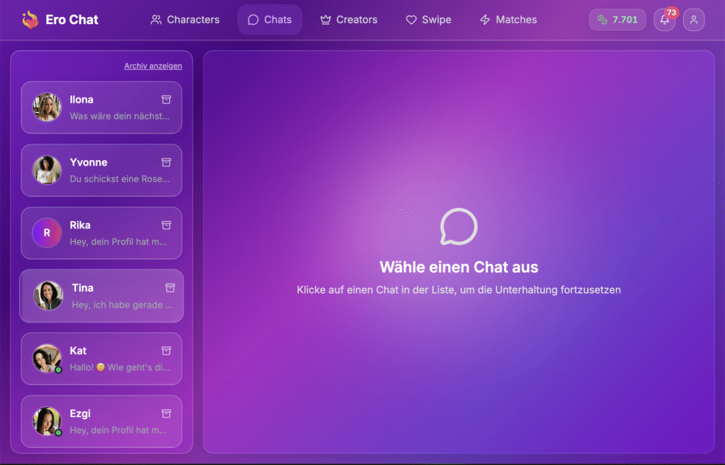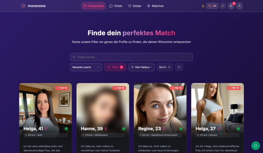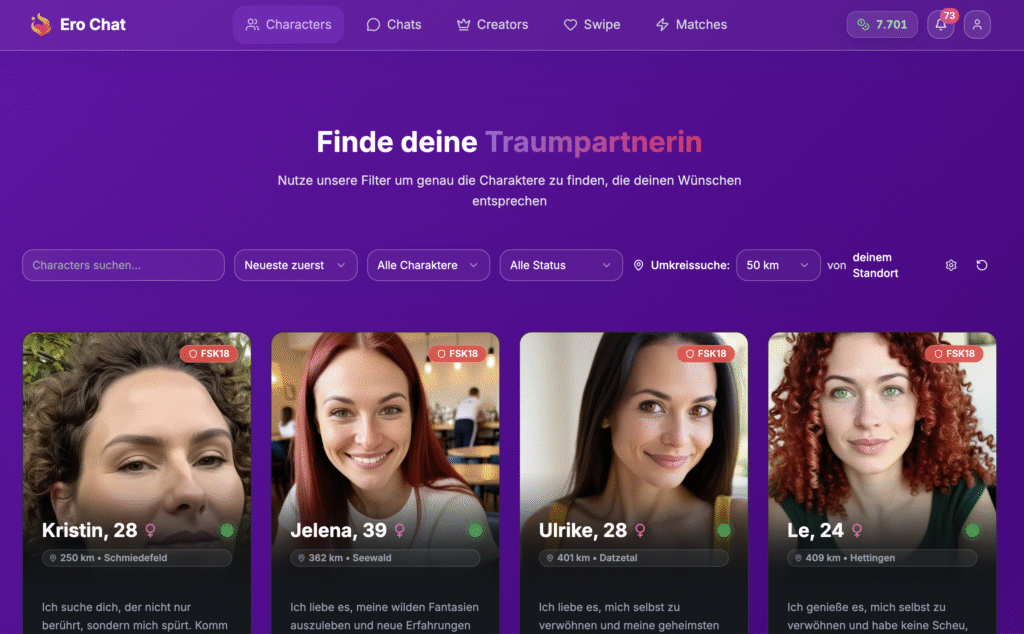 Mit Swipe entdecken Nutzer neue Charaktere über ein vertrautes UI mit Tageslimits und Matches – ideal als performantes Onboarding in den Chat. Der Creator-Space ergänzt dies durch exklusive Inhalte: Posts, Pay-per-View und monatliche Abos für Creator, inklusive direkter Interaktion. Beide Module sind optional, modular und unabhängig voneinander aktivierbar.