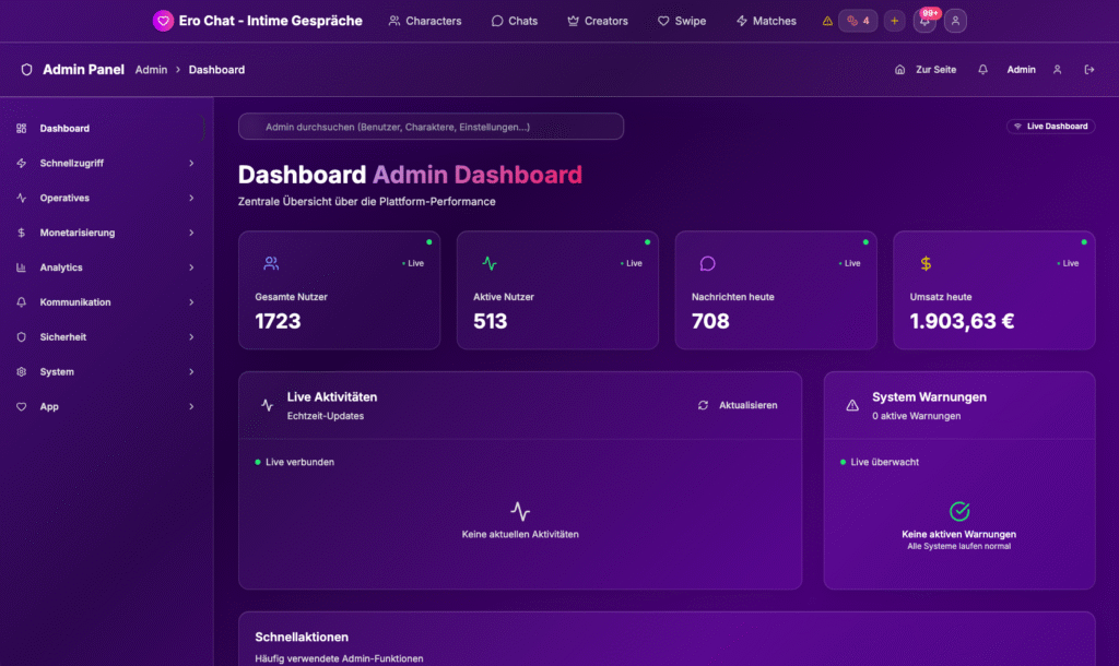 Im Admin-Bereich steuerst du Preise, Coin-Pakete, Abo-Modelle und Geschenke zentral; Texte und Übersetzungen sind direkt im System editierbar.