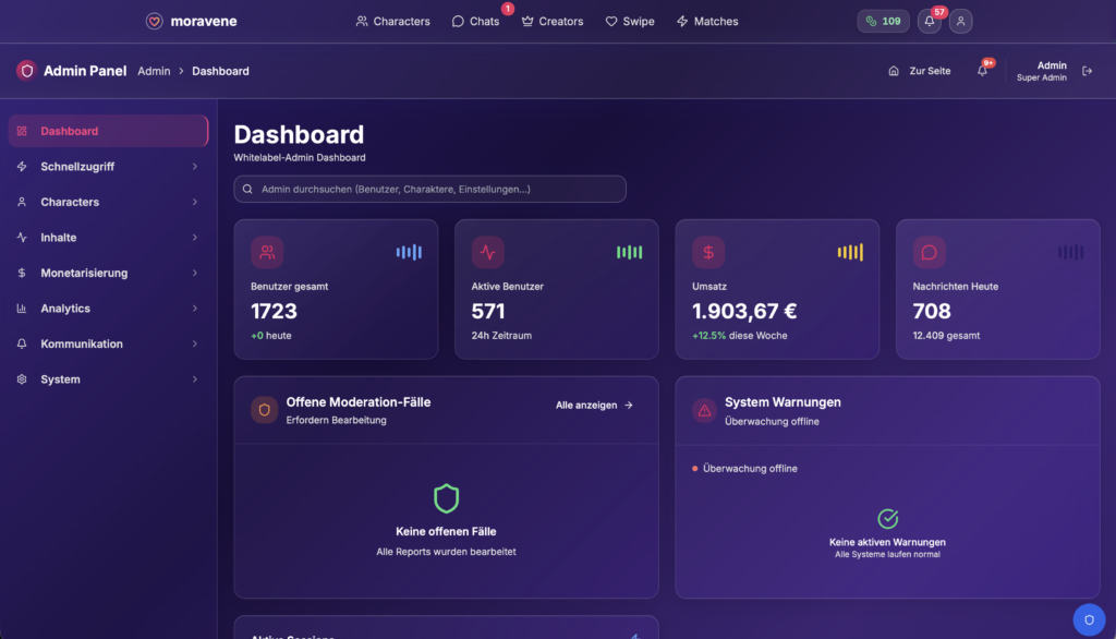 Im Admin-Bereich steuerst du Preise, Nutzungspakete, Abo-Modelle und digitale Items zentral; Texte und Übersetzungen sind direkt im System editierbar.