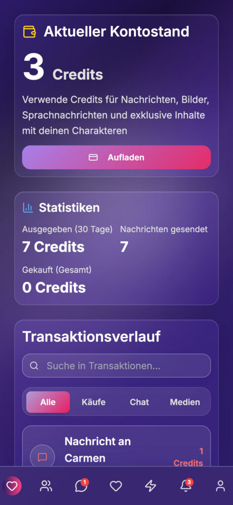 Die Kostenkommunikation ist transparent: Vor dem Senden zeigt die App, ob eine Nachricht unter Abo-Quotas fällt oder Coins benötigt – inklusive Low-Balance-Hinweis und direkter Auflademöglichkeit.